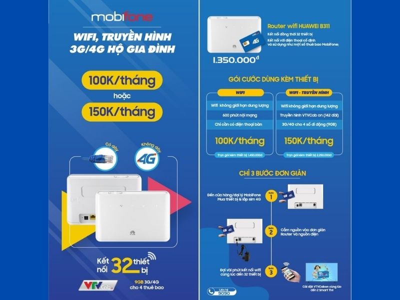 - Gói Huawei B311/ Gói Mobihome: Gần giống như gói MobiWifi nhắc tới ở trên, gói cước Mobihome cũng cho phép người dùng thoải mái truy cập và sử dụng dịch vụ Internet tốc độ cao một cách thỏa thích. Tuy nhiên, khi đăng kí gói này, bạn sẽ nhận được thêm nhiều dịch vụ khác nhau của Mobiphone, bao gồm cả dịch vụ viễn thông và dịch vụ cáp truyền hình. Vì điều đó, đây sẽ là gói cước phù hợp với những hộ gia đình có nhu cầu sử dụng Internet lớn đi kèm các dịch vụ khác.